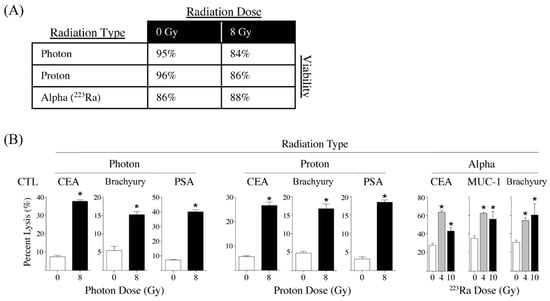 Sublethal exposure to photon, proton, or alpha radiation increases CTL lysis of prostate carcinoma cells in vitro. (A) Sublethal exposure of LNCaP prostate tumor cells in vitro to photon, proton radiation, or alpha radiation (223Ra) has minimal effect on cell viability. Human prostate carcinoma cells were mock-irradiated (0 Gy) or treated with either 8 Gy of photon radiation, 8 Gy proton radiation, or 8 Gy of 223Ra. Radiation-treated cells were cultured for an additional 72–96 h, and viability was determined by AO/PI viability dye. Depicted is % viable cells. (B) Human LNCaP prostate carcinoma cells were mock-irradiated (0 Gy, open bars) or treated with either 8 Gy of photon radiation (closed bars), 8 Gy proton radiation (closed bars), 4 Gy of of 223Ra (gray bars), or 10 Gy of 223Ra (closed bars). Radiation treated cells were cultured for an additional 72–96 h and then used as targets in an overnight CTL lysis assay. CEA-, MUC-1-, and brachyury-specific CD8+ T cells were used as effectors at an E:T ratio of 30:1. Experiments were repeated 1–3 times with similar results. * = p < 0.05. Adapted from [,,].