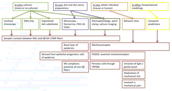 In silico analyses additionally revealed that Aβ fibers branch according to an asymmetric tree-like pattern on which the specific properties of MC complexes depend. Interestingly, the sensory role of MC complexes is not limited to gentle touch perception. They also contribute to the perception of mechanical allodynia through PIEZO2, with the contribution of MCs which remains to be explored. Similarly, most recent in vivo studies have revealed that MC complexes also modulate alloknesis. Additional in vitro and ex vivo approaches will be useful to identify the respective roles of the different neuronal and non-neuronal components. Thus, as Aδ and C fibers are present within MC complexes, the establishment of a functional co-culture model composed of MCs and Aδ and C fibers, as well as the study of human and rodent skin biopsies searching for potential synaptic contacts between MCs and Aδ and C fibers, could represent the first steps in the identification of MCs as initiators of alloknesis.