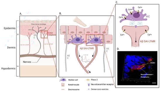Merkel cell–neurite complexes. (A). Merkel cells associated with slowly adapting type 1 (SA1) Aβ-low-threshold mechanoreceptor (Aβ-LTMRs) afferents neurons form the Merkel complex. They are present within the basal layer of the epidermis in both hairy and glabrous skin. (B,C). A light mechanical stimulation applied to skin triggers action potentials in Aβ SAI-LTMRs, ultimately leading to light touch. Activation of PIEZO2, a mechanically activated ion channel, leads to the release of calcium in Merkel cells, which causes SA1 impulses to be triggered by Aβ afferent neurons. (D). Representative three-dimensional reconstruction of a Merkel complex in hairy rat skin. In the photograph, contact between an Aβ fiber (yellow) and a Merkel cell (red) can be observed. Merkel cells were immunoreactive to anti-cytokeratin 20 (red) and the Aβ fiber to anti-neurofilament 200 (yellow) (confocal laser scanning microscopy). Scale bar = 5 µm. (Created with BioRender.com.).