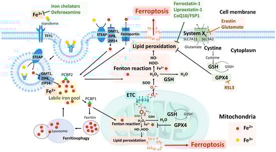 Regulatory pathways of ferroptosis. The iron metabolism (left) includes the endosomal uptake of ferritin-bound Fe3+, Fe3+ conversion to Fe2+ via STEAP proteins, Fe2+ release through the transporters DMT1 and ZIP8/14, and Fe2+ distribution to different intracellular regions via the chaperones, including PCBP1 and PCBP2. Iron is delivered to the labile iron pool, imported into the mitochondria, stored in ferritin, etc. In low-iron situations, the degradation of ferritin through ferritinophagy occurs and releases the ferritin-bound iron into the cytoplasm. In the case of excess iron, the iron is exported by ferroportin. The mitochondrial ETC generate O2—which is reduced to H2O2 by the antioxidant SOD. The H2O2 under the catalysis of Fe2+ from the labile iron pool participates in the Fenton reaction, creating hydroxyl radicals, which further activates lipid peroxidation, leading to ferroptosis. The system xc−/GSH/GPX4 axis (right) exerts antioxidative effects to prevent ferroptosis. Cystine is transported into the cell by system xc− and then converted to cysteine, which is a key component of GSH. The reducing activity of GSH keeps GPX4 in its reduced state to maintain the antioxidative abilities of GPX4. GPX4 can directly inhibit lipid peroxidation, therefore inhibiting ferroptosis. Inducers of ferroptosis inhibit system xc−, such as erastin and glutamate, or inhibit GPX4, such as RSL3. Inhibitors of ferroptosis include iron chelators, such as deferoxamine, and lipid peroxidation inhibitors, such as CoQ10, ferrostatin-1, and liproxstatin-1.
