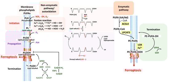 Fatty acids are essential constituents for membrane structures, and long-chain fatty acids that contain more than two double bonds are called PUFAs, which are mainly obtained from the diet []. PUFAs are an essential component of the phospholipid bilayer in biological membranes and influence the dynamics of lipids, protein−lipid interaction, and membrane transport properties []. In recent years, a considerable body of evidence has emerged, showing PUFAs as precursors for many signaling lipids and implicating PUFAs in various physiological functions, including inflammation, synaptic plasticity, and age-related neurodegenerative processes []. Lipid peroxidation is a process when oxidants, such as free radicals, “steal” electrons from the carbon–carbon double bond in unsaturated lipids and primarily form lipid peroxyl radicals and hydroperoxides []. Due to the higher number of double bonds in their structures, PUFAs are especially targeted for ROS attacks and are prone to chain oxidation []. Ferroptosis can be further induced by accumulation of oxidized PUFAs aroused from the iron-dependent Fenton reaction upon internal or environmental oxidative stresses [].