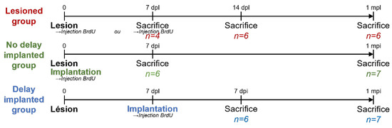 To determine newly generated cells, mice were given a single intraperitoneal injection with bromodeoxyuridine solution (BrdU, 50 mg/kg, NaOH 0.1 M, NaCl 0.9%, Sigma-Aldrich, St. Louis, MO, USA) the day of lesion or implantation and sacrificed at different time points.