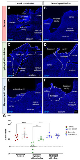 Cortical tissue loss one week and one month after the lesion. (A–F) Representative images of cells labeled with DAPI (blue) in lesioned (A,B) or implanted mice without delay (C,D) or with delay (E,F). Dashed lines indicate hydrogel localization. Scale bar: 200 μm. (G) Quantitative analysis of the cortical tissue loss over time in lesioned (red) or implanted mice without delay (green) or with delay (blue). Two-way ANOVA ** p < 0.01 **** p < 0.0001.