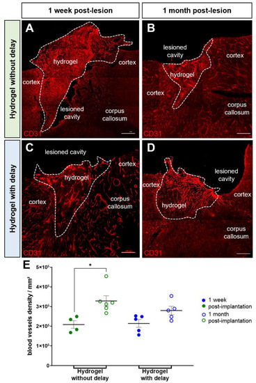 Angiogenesis has a major role in the repair of brain damage. To assess the angiogenic effect of hydrogel, immunohistochemical staining of CD31 was performed after one week or one month of hydrogel implantation. For this, we analyzed the vascular density in the implanted hydrogel by quantifying the area of blood vessels labeled with CD31 relative to the total area of the hydrogel. We found that the hydrogel was highly vascularized by the host as early as one week after implantation, whatever the time of its implantation (no delay: 2.1 ± 2.0 × 105 mm2; delay: 2.1 ± 2.0 × 105 mm2; Figure 3A,C,E). At one-month post-implantation, the hydrogel CD31 density increased, and this increase was much more pronounced for the no-delay implanted hydrogel compared to the delay implanted hydrogel (no delay: 3.3 ± 2.7 × 105 mm2; delay: 2.8 ± 2.1 × 105 mm2; p = 0.015; Figure 3B,D,E). These results suggest that the presence of a delay between the time of injury and hydrogel implantation does not impact the vascularization of the hydrogel.
