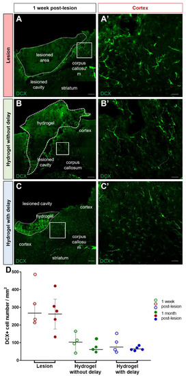 Neuroblasts generated in the adult subventricular zone (SVZ) migrate via the rostral migratory stream (RMS) to the olfactory bulb (OB) where they differentiate into the OB interneurons. We have previously shown that the cortical lesion stimulates the production of adult SVZ neuroblast as well as the ectopic migration of a part of these neuroblasts to the site of cortical injury [23]. Here, we investigated the impact of hydrogel implantation into the cortical lesion on host neuroblast cell migration. For this, we quantified the number of doublecortin (DCX) positive cells, a microtubule-associated protein expressed by migrating neuroblasts in the cortex as well as in the hydrogel implanted immediately or one week after cortical lesion.