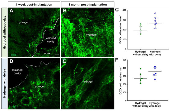 One week after the cortical lesion or hydrogel implantation, DCX+ cells were already present in the cortex adjacent to the injured cortex in all groups (Figure 4A–C,A′–C′). Quantification of the number of DCX+ neuroblasts in the cortex at one week, showed more DCX+ cells in the cortex of the injured group compared to both hydrogel implanted groups (Figure 4D; two-way ANOVA). Analysis of the neuroblast migration, one month after injury or hydrogel implantation, also showed more DCX+ cells in the cortex of the injured group compared to hydrogel implanted groups (Figure 4D). We next evaluated the presence of DCX+ cells within hydrogel (Figure 5A–D). The analysis of the results showed a similar number of DCX+ cells in the hydrogel implanted with a delay compared to no-delay implanted group, both at one week and one month after implantation (Figure 5E,F; Mann–Whitney test). The presence of DCX+ cells in the hydrogel may explain the fact that we observed fewer DCX+ cells in the cortex of the implanted groups compared to the injured group.