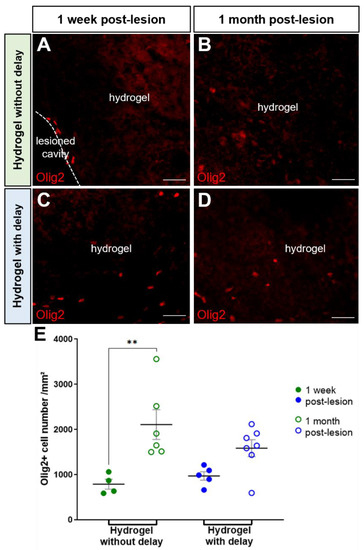 Oligodendrocytes into hydrogel. (A–D) Representative immunofluorescence staining of oligodendrocytes labeled with Olig2 (red) in no-delay (A,B) or delay implanted groups (C,D). Scale bar: 20 μm. (E) Quantitative analysis of the oligodendrocyte number into the corpus callosum over time in lesioned (red) or implanted hydrogel in no-delay (green) or delay groups (blue). Two-way ANOVA ** p < 0.01.