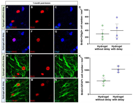 We found a large number of Olig2+ cells in both hydrogel implanted groups, and the number of oligodendrocytes was similar within hydrogels at one week and one month (Figure 7). Indeed, the number of oligodendrocytes/mm2 for the no-delay group was 787 ± 110 at one week and 2109 ± 329 at one month (Figure 7A,B,E). The number of oligodendrocytes/mm2 for delay implanted hydrogel was 971 ± 94 at one week and 1586 ± 1866 at one month (Figure 7C–E). Among these oligodendrocyte cell populations, at one month, we found 296.7 ± 125.8 Olig2+ /BrdU+ cells per mm2 in the no-delay implanted hydrogel group (Figure 8A–D), and 395.8 ± 195.3 Olig2+ /BrdU+ cells per mm2 for the delay implanted hydrogel group (Figure 8D–G).