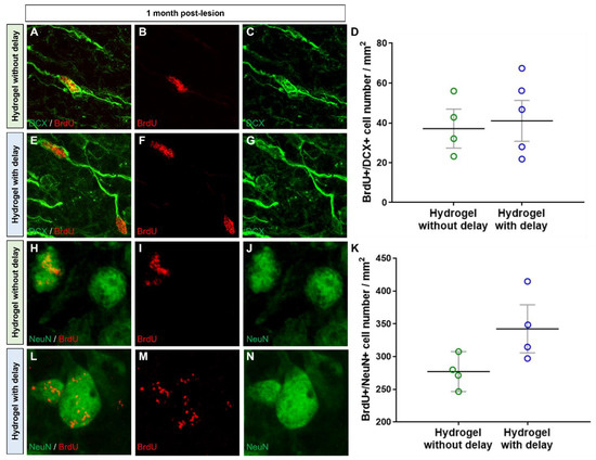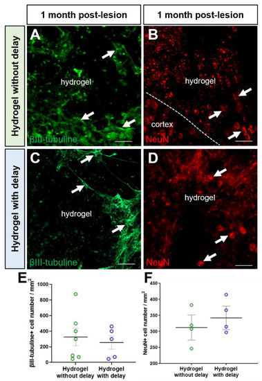 We also investigated the presence of mature neurons within the hydrogel. Interestingly, we found a large number of βIII-tubulin+ and NeuN+ neurons, within hydrogel, in the no-delay (Figure 10A,B,E,F) and delay (Figure 10C–F) hydrogel implanted groups. It is important to know if the neurons present in hydrogels are newly generated neurons or neurons already present in the host that migrated to the hydrogel. For this purpose, we analyzed the mature neurons containing BrdU and found numerous NeuN+/BrdU+ within the hydrogel in both conditions, indicating that they are newly generated neurons (Figure 9H–N). Next, we quantified the number of NeuN+/BrdU+ in hydrogels and found more NeuN+/BrdU+ in hydrogel implanted with delay, but the difference was not statistically significant (Mann–Whitney test; Figure 9K).