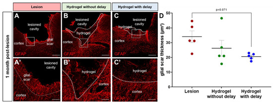Glial scar thickness one month after the lesion/implantation. (A–C) Representative immunofluorescence images of GFAP+ cells (red) in lesioned (A) or delay (B) or no-delay (C) hydrogel implanted groups. Dashed lines indicate the limit of the glial scar (A) or hydrogel localization (B,C). The squares indicate the area of magnification. Scale bar: 200 μm. (A′–C′) High magnification images of the glial scar. Scale bar: 20 μm. (D) Quantitative analysis of the glial scar thickness in lesioned (red) in delay (green) or in no-delay (blue) hydrogel implanted groups. Groups were compared using one-way ANOVA, p = 0.07.