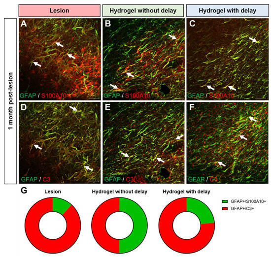 Anti and pro-inflammatory astrocytes in the cortex one month after the lesion/implantation. (A–F) Representative immunofluorescence staining of GFAP (green) colocalized with S100A10 ((A–C), red) or C3 ((E,F), red) in lesioned (A,D) in no-delay (B,E) or in delay (C,F) hydrogel implanted groups. Arrows indicate colocalization. Scale bar: 20 μm. (G) Representation of pro (red) and anti (green) -inflammatory astrocytes subtype proportion per condition. One-way ANOVA per subtype.