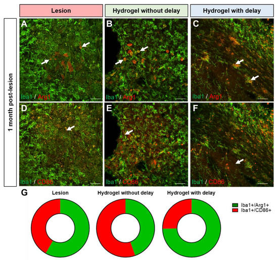 Anti and pro-inflammatory microglial cells in the cortex lesion one month after the lesion/implantation. (A–F) Representative immunofluorescence staining of Iba1+ cells (green) colocalized with Arg1 ((A–C), red) or CD86 ((D–F), red) in lesioned (A,D) or in no-delay (B,E) or delay (C,F) hydrogel implanted groups. Arrows indicate colocalization. Scale bar: 20 μm. (G) Representation of pro (red) and anti (green)-inflammatory microglia subtype proportion per condition. One-way ANOVA per subtype.