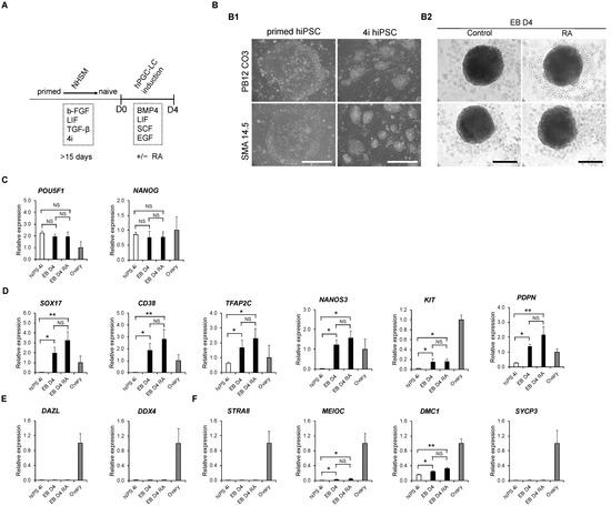 To optimize hPGC-LC specification, naive-like hiPSCs were derived from conventional/primed hiPSCs using the Naive Human Stem Cell Medium, as described before by Gafni et al. [13] (Figure 1A). After 15 days of derivation, the large-flattened conventional iPSCs changed into compact-domed colonies corresponding to a characteristic morphology for naïve-like hiPSCs [24] (Figure 1(B1)). hPGC-LCs were induced in vitro from naïve-like hiPSCs via embryoid bodies formation during 4 days of culture in the presence of BMP4, LIF, SCF and EGF (Figure 1A,B2). In order to situate these cells in their differentiation state, gene expression in the embryoid bodies was compared to human fetal ovaries aged from 7.8 to 10 GW. Day 4 EBs showed the maintenance of pluripotency genes (POU5F1 and NANOG, Figure 1C) with a significant increase of early PGC genes (SOX17, CD38, TFAP2C, NANOS3, KIT and PDPN) when compared with 4i hiPSCs (Figure 1D). However, late PGC genes, such as DAZL and DDX4 (also known as VASA), were only detected in the human fetal ovary (Figure 1E). Similarly, no expression was detected for the meiotic genes STRA8 and SYCP3 in day 4 EBs. MEIOC and DMC1, two other meiotic genes, displayed only a slight increase when compared with 4i hiPSCs (Figure 1F). Since it was proposed that RA regulates meiotic onset in both spermatogenesis and oogenesis [25], we wanted to assess whether RA treatment affects hPGC-LC differentiation. Surprisingly, RA did not influence the expression levels of pluripotency, early and late PGC nor that of meiotic genes when compared with day 4 EBs without RA (Figure 1C–F). Altogether, these data show that early hPGC-LCs can be specified from naïve-like hiPSCs via day 4 EB formation in vitro despite the fact that those cells lack gametogenic competency.