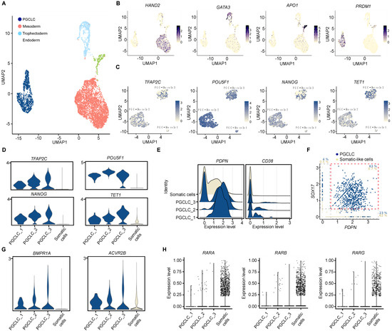 Transcriptional characterization of day 4 EB PGC-LC using scRNA-Seq. (A) Two-dimensional UMAP (Uniform Manifold Approximation and Projection) plot of the 5421 cells from two pools of day 4 EB. Cell clusters are colored according to the cell identity (mesoderm, endoderm, trophectoderm or PGC-LC lineages). (B) Projection of the expression level of HAND2 (mesoderm), GATA3 (trophectoderm), APO1 (endoderm) and PRDM1 (PGC). (C) Projection of the expression level of the PGC (TFAP2C, NANOG, and POU5F1) and the epigenetic (TET1) marker genes in the identified three sub-clusters of PGC-LCs. (D) Violin plots showing the expression of TFAP2C, NANOG, POU5F1 and TET1 genes in day-4 PGC-LCs compared to somatic cells. (E) Ridge Plot showing the expression levels of PDPN and CD38 genes in comparison to the cell density in different PGC-LC and somatic cell clusters. (F) Scatter plot shows the co-expression correlation of PDPN with the SOX17 PGC marker. The percentages of the cell types co-expressing or not SOX17 and PDPN genes are shown either in blue (PGC) or grey (somatic) (G) Violin plots for BMP signaling signature in PGC-LCs compared to somatic cells. (H) Violin plots showing the gene expression levels of retinoic acid receptors in the indicated conditions.