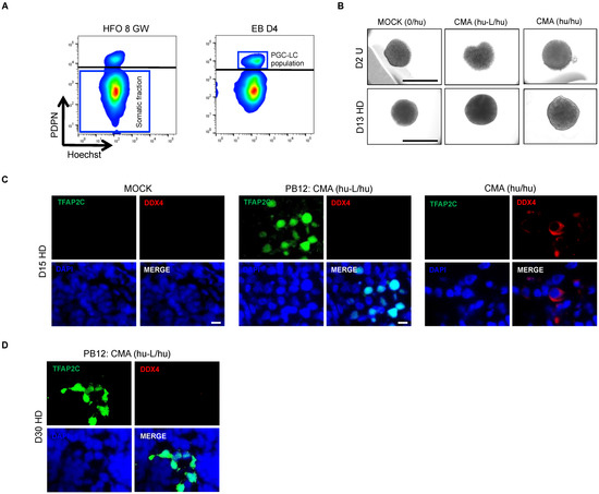 In vitro assessment of early hPGC-LC development when cultured in a somatic environment of human fetal ovary. (A) Cytometry plots show the somatic and germ cell populations from a human fetal ovary (plot on the left) and the PGC-LC fraction obtained from day 4 EBs (plot on the right). The day 4 EBs PDPN-positive cells were mixed with the ovarian PDPN-negative cells at a ratio of 2:8 (B) Images of day 2 (top row) and day 15 (bottom row) of re-aggregated ovaries in the absence (MOCK) or presence of the PDPN-positive human PGC-LCs [CMA (hu-L/hu)]. A positive control was used by mixing authentic PDPN-positive hPGCs with the ovarian somatic cells population [CMA (hu/hu)]. Scale bar, 500 µm. (C) Immunofluorescence analyses for the absence or presence of TFAP2C and DDX4 proteins in MOCK, CMA (hu-L/hu) and CMA (hu/hu) conditions at day 15 of culture. (D) Immunofluorescence analyses for the absence or presence of TFAP2C and DDX4 proteins CMA (hu-L/hu) condition at day 30 of culture. CMA hu/hu: Cell Mixture Aggregate (human PGCs/human somatic cells); CMA hu-L/hu: Cell Mixture Aggregate (human PGC-like Cells/human somatic cells); D15 HD: Day 13 from Hanging Drop; D30 HD: Day 28 from Hanging Drop; D2 U: Day 2 from U-bottom low adherence 96 well plate; EB D4: Embryoid Body at Day 4; HFO 8 GW: Human Fetal Ovary of 8 Gestational Week; MOCK (0/hu): 8 gestational week human ovarian somatic cells.