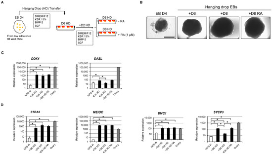 In vitro overexpression of late hPGC-LC and meiotic gene markers in hanging drop-transferred embryoid bodies. (A) Schematic illustration of in vitro culture procedure of day 4 embryoid bodies in the hanging drop culture system. At day 10, embryoid bodies are exposed or not to RA for 48 h. (B) Images of (i) a day 4 EB in a U-bottom low adherence 96-well plate, (ii) a day 10 EB, and (iii) day 12 EBs in the absence or presence of RA. Scale bar, 500 µm. (C,D) Gene expression analyses by RT-qPCR of late PGC (C) and meiotic gene (D) markers in day 0 hiPSC 4i (n = 4), day 10 EBs (+D6 HD; n = 3), day 12 EBs in the absence or presence of RA (+D8 HD or +D8 HD RA; n = 3 for both) and human fetal ovary (n = 3), * p < 0.05. +D6 HD: +Day 6 in hanging drop; +D8 HD: +Day 8 in hanging drop; +D8 HD RA: +Day 8 in Hanging drop with Retinoic Acid; EB D4: Embryoid Body at Day 4.