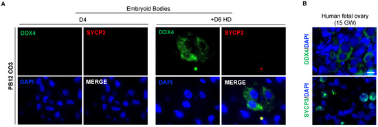Assessment of late PGC and meiotic proteins expression in PB12 hiPSCs-derived EBs at day 4 and day 10. (A) Immunofluorescence analyses of DDX4 and SYCP3 proteins expression in PB12 hiPSCs-derived EBs at day 4 (left panel) and day 10 (right panel). Scale bar, 10 µm. (B) Immunofluorescence detection of DDX4 and SYCP3 proteins in 15 GW human fetal ovary, used as a positive control. Scale bar, 10 µm. +D6 HD: +Day 6 in hanging drop; EB D4: Embryoid Body at Day 4; GW: Gestational Week.