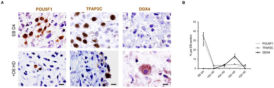 To better understand the kinetics of development of hPGC-LCs in vitro, an immunohistological analysis was performed on EB sections for POU5F1, TFAP2C and DDX4 proteins (Figure 8A). On day 4 EBs, POU5F1- and TFAP2C-positive proteins are present at a mean percentage of 30.12 and 35.11%, respectively, while the DDX4 protein is completely absent (Figure 8B). In +D2 HD, the mean percentages of OCT4-postive and TFAP2C-positive cells are dramatically decreased when compared with day 4 EBs, and DDX4 protein is still undetectable (Figure 8B). Interestingly, while the dramatic decrease of POU5F1 and TFAP2C was maintained between +D2 HD and +D8 HD, the DDX4 protein appeared for the first time in 3.80% of cells per EB section in +D4 HD (Figure 8B). A significant increase in the mean percentage of DDX4-positive cells was observed in +D6 HD when compared with +D4 HD (13.09% vs. 3.80%; p = 0.01). Although the DDX4-positive cells maintained a proliferation potential in +D6 HD as they expressed the PCNA marker (Figure S7), DDX4 expression at the protein level disappeared in +D8 HD (Figure 8B). Thus, downregulation of pluripotency precedes the apparition of late PGC markers. Unfortunately, it seems that differentiated hPGC-LC cannot be further maintained in the hanging drop model and likely require a more appropriate niche at this stage.