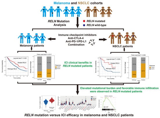 A total of 457 melanoma and 995 NSCLC cases with mutational data, gene expression profiles, and clinicopathological information in the Cancer Genome Atlas (TCGA) cohort were acquired from Genome Data Commons (https://gdc.cancer.gov, accessed on 1 September 2022). In particular, the gene expression profiles of both tumors in the TCGA were employed for the immunological mechanism exploration of RELN mutations.