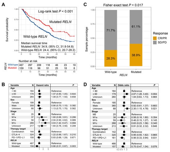 Significant ICI survival benefits were observed in melanoma patients who harbored RELN mutations (median survival time: 34.9 vs. 24.4 months, Log-rank test p < 0.001; Figure 2A). We further incorporated multiple confounding factors (e.g., age, sex, stage, and therapy type) into a multivariable Cox regression analysis, and the association between RELN mutations and favorable ICI survival was still noticed (HR: 0.66, 95% CI: 0.51–0.87, p = 0.003; Figure 2B). Roles of RELN mutations in evaluating ICI treatment prognosis in included single cohorts, and distinct treatment types are illustrated in Figures S3 and S4. Further analysis demonstrated that RELN mutations were also connected with a significantly elevated ICI response rate (38.9% vs. 28.3%, Fisher exact test p = 0.017; Figure 2C). a multivariable logistic regression analysis with the confounding variables taken into account still revealed a positive association (OR: 0.70, 95% CI: 0.47–1.04, p = 0.076; Figure 2D).