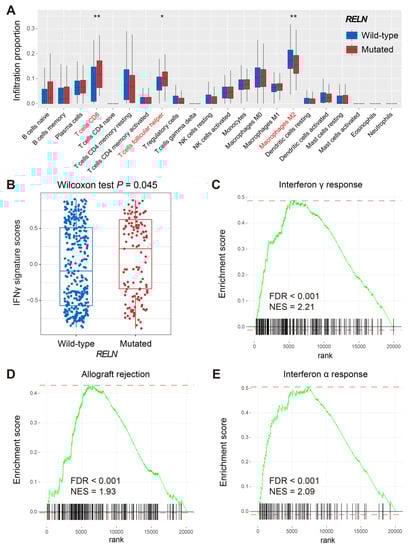 The CIBERSORT algorithm was used to evaluate distinct immunocyte infiltration levels between RELN subgroups in melanoma (Figure 5A). Results showed that pro-inflammatory immunocytes (e.g., CD8 T cells and T follicular helper cells) were significantly enriched in RELN-mutated melanoma patients (Wilcoxon rank-sum test, both p < 0.05). However, the infiltration abundance of immune-suppressive cells (e.g., M2 macrophages) was decreased in the subgroup mutated in this way (Wilcoxon rank-sum test, p < 0.01). The subsequent ssGSEA method revealed that patients with RELN mutations harbored significantly higher enrichment scores of IFNγ signature when compared with wild-type patients (Wilcoxon rank-sum test, p = 0.045; Figure 5B). GSEA results indicated that immunogenicity-related signaling pathways of interferon γ/α response and allograft rejection were observed in RELN-mutated melanoma patients (all FDR < 0.001; Figure 5C–E).