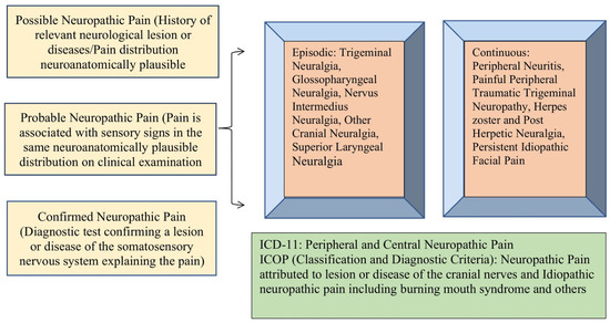 Neuropathic pain is generally classified in relation to the agent of insult and anatomic distribution [33]. There are various classifications of neuropathic pain reported in the literature. According to Woolf, a classification should be valid, reliable, and generalizable. However, the dynamic nature of the nociceptive system, particularly in abnormal conditions, may be an impediment to discovering such a universal classification [34]. It is difficult to meet the demands when orofacial neuropathic pain disorders are dominated by subjective symptoms and the associated clinical signs are few or nonexistent. Various scales and questionnaires have been developed in the literature to demonstrate discriminative features between neuropathic and non-neuropathic pain states. Recently, a grading system that classified neuropathic pain as possible, probable, and definite was updated [11]. The different levels were determined by the experts based on neurological history, pain distribution, the presence and location of sensory signs, and, finally, on a confirmatory test, neuropathic pain can be peripherally generated or centrally mediated. In some patients with post-herpetic neuralgia, central post-stroke pain, and compression by space-occupying lesions, the underlying cause of neuropathic pain is obvious, while for certain mixed conditions it is challenging for the clinician to delineate the boundaries of neuropathic and non-neuropathic pain.As a result, neuropathic pain is typically categorized according to an underlying disease. In the newly released ICD11 classification, neuropathic pain is first organized into peripheral and central neuropathic pain based on the location of the lesion or disease in the peripheral or central somatosensory nervous system [35]. Within each of these categories, the pain is classified into different neuropathic pain conditions based on the underlying disease.