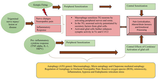 Autophagy is generally regulated by a variety of stresses, including reactive oxygen species (ROS), mitotoxicity, inflammation, and endoplasmic reticulum (ER) stress. The influence of these stresses on autophagy has been studied in the literature on neuropathic pain models [25]. From these studies, it is observed that ROS contribute to peripheral and central sensitization following nerve injury, resulting in neuropathic pain. ROS have been found to be unregulated in microglia, astrocytes, and spinal neurons in studies. Furthermore, blocking the mitochondrial electron chain reduces hyperalgesia in a range of neuropathic pain models [79,80]. Although neuropathic pain causes baseline activation of autophagy in response to ROS formation, a significant degree of ROS-mediated oxidative stress also aids in the replacement of damaged components with new healthy ones [81,82]. Overall, ROS have been shown to both positively and negatively regulate autophagy depending on the levels and context. Similarly, Mitochondrial dysfunction has been found to be a major mechanism underlying the neuronal dysfunction associated with peripheral neuropathies; however, its role in orofacial neuropathic pain has not been explored. Typically, mitochondrial dysfunction in neurons leads to disturbed neurotransmission, and defective autophagy signaling is known to be associated with neuropathic pain [28,83,84]. Hence, the identification of drugs which sustain the mitochondrial function and health could aid the search in finding a better therapeutic strategy, which might open new prospects in the treatment of orofacial neuropathic pain. Another stressor, ER stress, means the accumulation of unfolded proteins in cells. This is also considered to be involved in the induction and maintenance of neuropathic pain. However, more studies are needed to investigate the relationship of different stressors in orofacial neuropathic pain.