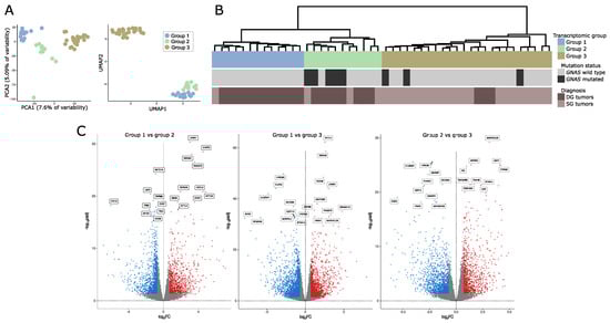 Gene expression in somatotroph tumors. (A) Principal component analysis (PCA) and uniform manifold approximation and projection (UMAP) results based on the expression data for the entire set of genes that indicate the presence of three transcriptomic groups of somatotroph tumors. (B) Hierarchical clustering of somatotroph PitNETs according to the expression data for the entire set of genes, presented with basic diagnostic data and GNAS mutation status. DG stands for densely granulated somatotroph PitNET, while SG stands for sparsely granulated somatotroph PitNET. (C) Comparison of genes expression in pairs of particular transcriptomic groups.