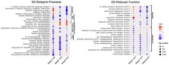 The functional implications of the difference in gene expression were investigated with GSE analysis with Gene Ontology (GO) including GO Biological Processes and GO Molecular function. The analysis resulted in the identification of a large number of significantly enriched GO terms. The most significantly enriched GO Biological Processes, according to the highest significance level were the terms related to G-protein signaling, ion transport, cellular adhesion, and differentiation, while the most enriched GO Molecular function terms were those related to signaling and ion transport. The top 10 most enriched terms for each comparison are presented in Figure 2; all significantly enriched terms are listed in Supplementary Table S3.