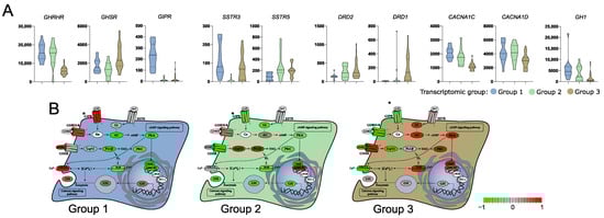 With a given high number of DEGs we paid a special attention to those that are related to GH secretion. According to literature data growth hormone secretion is primarily induced by hypothalamic somatoliberin (GHRH) as well as by ghrelin and GIP through activation of the corresponding membrane receptor on somatotroph cells. Interestingly, we found that the three identified transcriptomic groups of somatotroph PitNETs differ significantly in the expression of genes coding for each receptor. Tumors within groups 1 and 2 have high expression of GHRHR (somatoliberin receptor), but lower expression of GHSR (ghrelin receptor) than tumors in group 3. Tumors in group 1, in addition to high GHRHR expression, have notably higher expression of GIPR than the two remaining transcriptomic groups. Differences were also found among genes of somatostatin and dopamine receptors that play a role in modulation of somatotroph secretory activity. Expression of SSTR3 was at a notably lower level in group 2, while a significant decrease of SSTR5 in group 1 was observed as compared to groups 2 and 3. Higher expression of dopamine receptors DRD1 and DRD2 was in turn found in group 3. Irrespectively to receptor activation, Ca2+ influx through voltage-gated Ca2+ channels (VGCCs) also plays an important role in GH secretion []. CACNA1C and CACNA1D encoding VGCCs were identified as expressed at significantly higher levels in groups 1 and 2 as compared to group 3 (Figure 2). The signaling pathways downstream key receptors (cAMP and Phospholipase C pathways) are mediated by many proteins that are encoded by the genes that were differentially expressed between three transcriptomic groups. They include genes encoding G-proteins: GNAI1, GNAI2, adenyl cyclase ADCY1, ADCY3, ADCY4, ADCY5, ADCY7; cAMP response elements CREB1, CREB3L1, ATF2, ATF5B, ATF4, CREB, CREBP, EP300; phospholipases C: PLCB2, PLCB4, PLCB1; and protein kinases C: PRKCA, PRKCD, PRKCE, PRKCI, PRKCZ, as well as inositol trisphosphate receptor ITPR3. Details are presented in Supplementary Figure S2A, while comprehensive representation of the expression levels of genes involved in GH secretion is presented in Figure 2, which is based on KEGG pathway (visualized with pathview, original picture available in Supplementary Figure S2B). GH1 encoding GH was also found differentially expressed, with the highest expression in transcriptomic group 1 and the lowest in group 3 (Figure 3A).