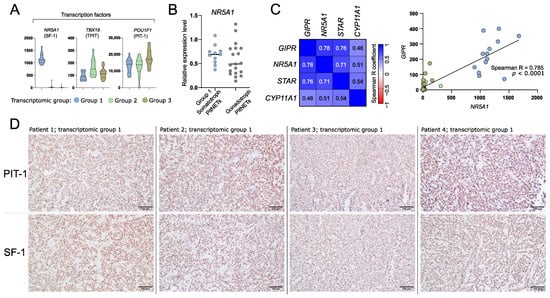 Transcriptomic group 1 tumors are those with high GIPR expression. GIPR was previously found to be involved in steroidogenesis process. It induces expression of known steroidogenesis-related genes including NR5A1, STAR, and CYP11A1 [,]. As expected, higher expression of these genes was found in group 1 tumors as compared to each of the other groups. Accordingly, a significant correlation of the expression levels of GIPR and each of NR5A1, STAR, and CYP11A1 was found, with the highest correlation coefficient in GIPR and NR5A1 analysis (Spearman R = 0.785, p < 0.0001) (Figure 5C).