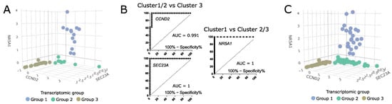We determined the genes that are differentially expressed between each of the transcriptomic groups by comparing each group with the remaining groups separately (group 1 vs. group 2, group 2 vs. group 3, and group 2 vs. group 3). We found that paired groups differ in the expression of high number of genes. Specifically, 1007 differentially expressed genes (DEGs) that met criteria │FC│ > 2 and adjusted p-value < 0.05 were found when comparing groups 1 and 2, 2403 DEGs were identified when comparing groups 1 and 3, and 1685 DEGs were found in comparison of groups 2 and 3. Results of differential analysis are presented in Figure 1B. The lists of differentially expressed genes are reported in Supplementary Table S2.