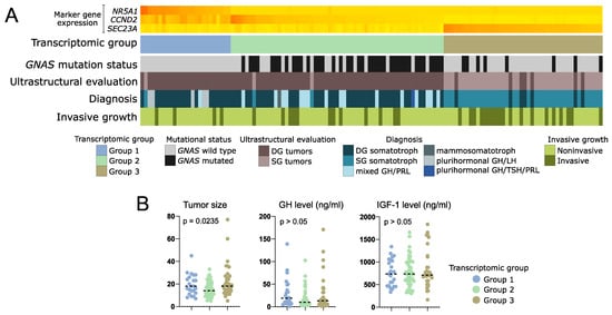 Clinical data of patients with somatotroph PitNETs categorized according to expression of marker genes into three transcriptomic groups. (A) Presentation of categorical patient characteristics. (B). Comparison of quantitative patient data including tumor size (maximal tumor diameter) as well as GH and IGF-1 plasma level. Horizontal dashed line indicates median. p-value assessed with Kruskal–Wallis test.