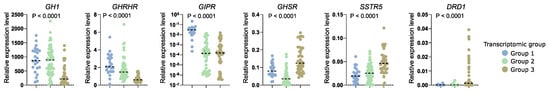 RNA-seq results revealed that transcriptomic groups differ in the expression level of key genes involved in GH synthesis and secretion including GHRHR, GIPR, GHSR, SSTR, and DRD1 as well as GH1 encoding GH itself. Using qRT-PCR we measured expression level of these genes in the entire patient cohort categorized into three transcriptomic groups according to marker genes evaluation. Significant differences in the expression of each gene were found and confirmed the observation in whole transcriptome analysis. Groups 1 and 2 have high levels of GH1 and GHRHR. Tumors in group 1 have high GIPR expression, while those in group 3 have higher expression of ghrelin receptor (GHSR) and DRD1. A slight discrepancy was observed between qRT-PCR results of the entire cohort and data from RNA-seq in terms of SSTR5 expression level. PCR-based measurement showed the highest level of SSTR5 expression in transcriptomic group 3. Results are visualized in Figure 8.