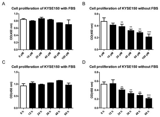 Cell proliferation of KYSE150 under different conditions. (A,B) Cells were treated with EGCG at concentrations from 0~100 μM with (A) or without (B) FBS for 24 h. (C,D) Cells were treated with 60 μM EGCG at a series of time points from 0~60 h with (A) or without (B) FBS. Data are shown as mean ± SD. n = 3, **: p < 0.01; ***: p < 0.001.