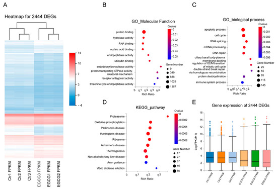 Analysis of 2440 differentially expressed genes (DEGs). (A) Heatmap showing the expression patterns before and after EGCG treatment. (B) GO analysis of molecular function for DEGs. (C) GO analysis of the biological process for DEGs. (D) KEGG pathway enrichment for DEGs. (E) The expression level of DEGs before and after EGCG treatment.