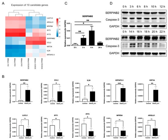 Validation of DEGs in KYSE150 cells. (A) Heatmap showing the expression levels of the top 10 up-regulated and down-regulated genes in RNA-seq. (B) Verification of DEGs after EGCG treatment for 6 h in KYSE150 cells. (C) Relative expression of SERPINB2 after EGCG treatment at 0, 3, 6, and 24 h in KYSE150 cells. (D) Changes of SERPINB2 and Caspase-3 protein levels at different time points in KYSE150. Data are shown as mean ± SD. n = 3, *: p < 0.05; **: p < 0.01; ***: p < 0.001, ns: not significant.