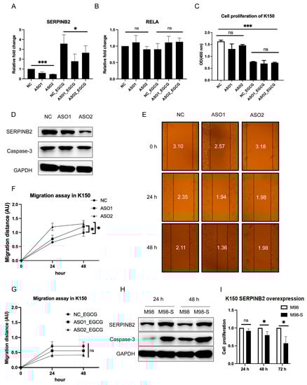 To investigate the function of SERPINB2 in esophageal cancer cells, we performed knockdown experiments using antisense oligonucleotides (ASO) (Figure 4A,D and Figure S4A,D). The expression of SERPINB2 significantly reduced after gene knockdown regardless of EGCG treatment, and the SERPINB2 levels were constantly higher in the presence of EGCG versus no EGCG. (Figure 4A and Figure S4A). Unexpectedly, knockdown of SERPINB2 did not affect cell viability regardless of EGCG treatment (Figure 4C and Figure S4C). Importantly, we observed a significant increase in cell migration of KYSE150 (Figure 4E,F) and KYSE510 (Figure S4E,G) in the absence of EGCG after SERPINB2 knockdown. However, the migration-promoting effect of SERPINB2 downregulation was prohibited by EGCG treatment (Figure 4G and Figure S4F,H). In addition, cells treated with SERPINB2-ASO showed decreased protein levels of Caspase-3 (Figure 4D and Figure S4D), suggesting that SERPINB2 was closely related to cell apoptosis. Consistently, overexpression of SERPINB2 induced high expression of Caspase-3 and impaired cell viability (Figure 4H,I and Figure S4I).