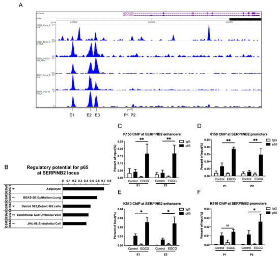 Next, we aimed to explore the regulatory mechanism of EGCG on SERPINB2 expression. To this end, we searched for potential transcriptional factors (TFs) that bind to the promoter and enhancer regions of SERPINB2 on the Cistrome Browser [25]. Currently, no ChIP-seq data are available for esophagus cancer cells, so we screened the TFs using five independent data sets (GEO accession ID: GSM1566734, GSM2103051, GSM2419824, GSM1305212, GSM2394421), including adipocyte, lung epithelium cells, Detroit 562 cells, and endothelium cells (Figure 5A). We identified the subunit of NF-κB, p65 with a high capacity of binding and regulatory potential at both regions (Figure 5B). Thus, we conducted ChIP PCR to verify three p65 binding sites at the enhancer region and two at the promoter before and after EGCG treatment in both KYSE150 and KYSE510. We observed significant increases for p65 enrichment at the two sites of the promoter, as well as the enhancer E1 and E3 after EGCG treatment for 2 h (Figure 5C–F). However, p65 binding at E2 was not affected by EGCG treatment (Figure S5A,B).