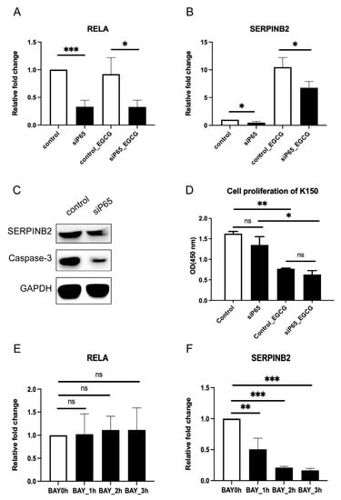 p65 regulates the expression of SERPINB2 in KYSE150 cells. (A,B) Relative fold change of RELA (A) and SERPINB2 (B) after p65 knockdown with or without EGCG. (C) Western blotting showing protein levels of SERPINB2 and Caspase-3 after p65 knockdown. (D) Cell proliferation after p65 knockdown. (E,F) Relative fold change of RELA (E) and SERPINB2 (F) expression after p65 inhibition. Data are shown as mean ± SD. n = 3, *: p < 0.05; **: p < 0.01; ***: p < 0.001, ns: not significant.