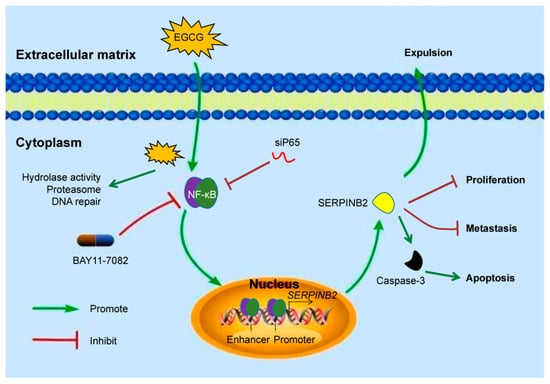 More importantly, SERPINB2 was directly related to tumor promotion and poor prognosis in various cancers such as bladder [15], colorectal [16], endometrial [17], and ovarian [18] cancers. SERPINB2 might act as a regulator or biomarker for predicting metastatic progression in breast and liver cancers [5,19]. SERPINB2 expression significantly increased in response to various tumorigenic agents in multiple cancer stem cell types [20]. However, the function of SERPINB2 has not been characterized in esophageal cancer. Herein we identified SERPINB2 as an EGCG-regulated tumor-suppressor gene that was mediated by NF-κB and confirmed the role of SERPINB2 in cell migration and apoptosis.
