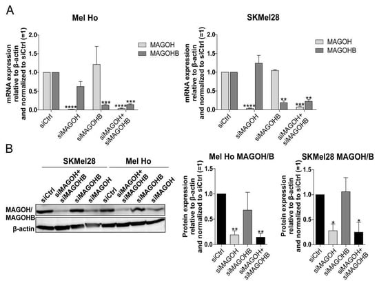 SiRNA-mediated knockdown of MAGOH and MAGOHB expression in the cutaneous melanoma cell lines Mel Ho and SKMel28. (A) Relative MAGOH and MAGOHB mRNA expression compared to β-actin(ΔCP), measured with qRT-PCR, after 24 h (Mel Ho) or 48 h (SKMel28) of transfection with siRNAs targeting MAGOH, MAGOHB or both, normalized to a control siRNA (mean ± SD of n = 3, ** = p < 0.01, *** = p < 0.001, **** = p < 0.0001, one sample t-test compared to 1). (B) Western blot analysis of MAGOH/MAGOHB protein expression after 48 h transfection of Mel Ho and SKMel28 with siRNAs targeting MAGOH, MAGOHB or both, compared to a control siRNA. Bar graphs show the quantification of MAGOH/MAGOHB protein levels compared to β-actin (mean ± SD from n = 3, * = p < 0.05, ** = p < 0.01, one sample t-test compared to 1).