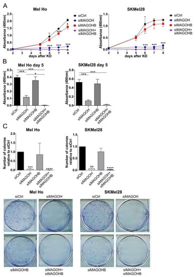 Our data indicate a critical role of MAGOH/MAGOHB expression for the tumor development of cutaneous malignant melanoma. To analyze which role each of the two homologues plays for melanoma tumorigenesis, siRNA-mediated knockdown (KD) of MAGOH and MAGOHB was performed for two cutaneous melanoma cell lines, Mel Ho and SKMel28, in a single and combined approach. The KD was proven efficient on the RNA level with the use of qRT-PCR as a KD of MAGOH (siMAGOH) significantly reduced MAGOH mRNA expression and a KD of MAGOHB (siMAGOHB) significantly reduced MAGOHB (Figure 2A). The combined KD of both (siMAGOH + siMAGOHB) significantly reduced the mRNA expression of both homologues to a comparable level with the respective single siRNA.