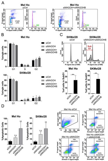 Previous studies have identified that e.g., in gastric cancer, a depletion of MAGOH or MAGOH and MAGOHB, next to inducing apoptosis, also significantly inhibited cell cycle progression []. Interestingly, no significant effect on cell cycle phases was observed after MAGOH or MAGOH/MAGOHB KD for our melanoma cell lines. This could mean that, compared to other cancer types, cutaneous melanoma exhibits an increased sensitivity to MAGOH (and MAGOHB) depletion with regards to apoptosis, meaning that cutaneous malignant melanoma cells undergo apoptosis before the cell cycle is affected.
