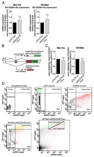 MAGOH and MAGOHB do not influence alternative splicing of pro-apoptotic Bcl-XS or exon skipping of a fluorescent splicing reporter in cutaneous malignant melanoma. (A) MAGOH and MAGOHB were knocked-down in Mel Ho and 501Mel for 96 h using a siPool and the mRNA levels of Bcl-XS and Bcl-XL were measured with qRT-PCR relative to β-actin (ΔCP). The ratio of Bcl-XS/Bcl-XL expression was normalized to cells transfected with the siCtrl Pool. (mean ± SD from n = 3, n.s. = not significant, one sample t-test compared to 1). (B) To analyze alternative exon usage, a reporter plasmid was utilized, which leads to the translation of a green fluorescent protein (EGFP), if an upstream exon is included during splicing of the reporter mRNA or to translation of a red fluorescent protein (dsRED), when the upstream exon is skipped. (C) MAGOH and MAGOHB were knocked-down in Mel Ho and 501Mel with the siMAGOH/B Pool for 24 h followed by additional 24 h transfection of the splicing reporter plasmid. Fluorescent cells were analyzed by flow cytometry. The ratio between exon skipping/exon inclusion was determined and compared to the siCtrl Pool (mean ± SD from n = 3, n.s. = not significant, one sample t-test compared to 1). (D) Exemplary pictures showing the gating used for flow cytometry of the splicing reporter analyzed in C. Transfection of plasmids expressing only dsRED or only EGFP were used as controls to set the gate for the double positive population. In cells transfected with the reporter, the heterogeneous cell population, expressing both red and green fluorescent proteins, was evaluated. For these cells, the ratio between exon inclusion and exon skipping was determined as indicated.