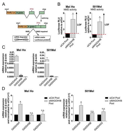 MAGOH and MAGOHB influence NMD activity and the expression of GADD45A in cutaneous malignant melanoma. (A) The NMD reporter plasmid encodes a firefly luciferase (Luc.), fused to a PTC-containing β-globin sequence, inducing degradation of the luciferase mRNA via NMD. A loss of function (LOF) of NMD impairs sensing of the PTC, leading to an increased luciferase signal. (B) MAGOH and MAGOHB were knocked-down in Mel Ho and 501Mel using the siMAGOH/B Pool for 24 h, followed by another 24 h transfection with the NMD reporter or the control plasmid. Luciferase relative light units (RLU) were calculated as (average luciferase/renilla NMD reporter)/(average luciferase/renilla control plasmid) and normalized to the siCtrl Pool (mean ± SD from n = 3, * = p < 0.05, one sample t-test compared to 1). (C) MRNA expression of GADD45A, GADD45B and GADD45G was analyzed relative to β-actin (ΔCP) with qRT-PCR in Mel Ho and 501Mel (mean ± SD from n = 3). (D) MRNA expression of GADD45A, GADD45B and GADD45G after KD of MAGOH/B for 48 h was investigated with qRT-PCR relative to β-actin (ΔCP) and was normalized to the siCtrl Pool (mean ± SD from n = 3, * = p < 0.05, n.s. = not significant, one sample t-test compared to 1).