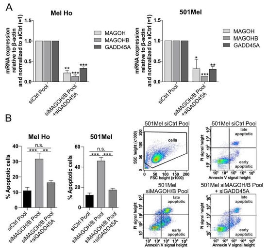 To analyze how the increased GADD45A expression after MAGOH and MAGOHB deficiency in cutaneous melanoma cells influences the observed apoptotic phenotype, siMAGOH/B Pool-transfected melanoma cells were additionally transfected with a siRNA targeting GADD45A. Thereby, the increased GADD45A expression observed after the loss of MAGOH/B could be efficiently downregulated in the cutaneous melanoma cell lines Mel Ho and 501Mel (Figure 7A). Furthermore, additionally knocking down GADD45A expression after KD of MAGOH/B significantly decreased the occurrence of apoptosis in melanoma cells (Figure 7B), indicating that the increased GADD45A expression might be one of the main reasons behind the apoptosis observed after loss of MAGOH and MAGOHB expression in cutaneous malignant melanoma cells.