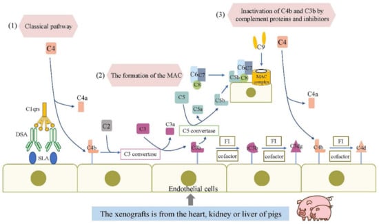 The activation of a complement is controlled in part by complement regulatory proteins (CRPs) that are the integral components of cell membranes. EC activation in the xenograft setting is a key step in the pathophysiology of AVR, and the data suggest that the classic complement pathway plays a major role in the human serum-induced activation of porcine endothelial cells (ECs) [17]. The first breakthrough in xenotransplantation research was the report of species differences in the complement system, which found that the rejection in guinea pigs of rat xenotransplantation models was caused by the primary activation of the complement via a surrogate pathway [18].
