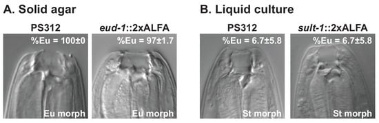 EUD-1 and SULT-1 ALFA tagging in P. pacificus (A,B) Images depicting the eurystomatous (Eu) (A) or stenostomatous (St) (B) morphs of PS312, eud-1::2xALFA and sult-1::2xALFA animals grown on agar plates (A) and liquid cultures (B). Eu worms have a wide-mouth with two teeth. The bacterial feeding St worms show a narrow mouth with a single tooth. The numbers in the images represent the mean value ± the standard deviation of mouth–form ratio in the different environmental conditions and worm strains presented as percent Eu (% Eu).