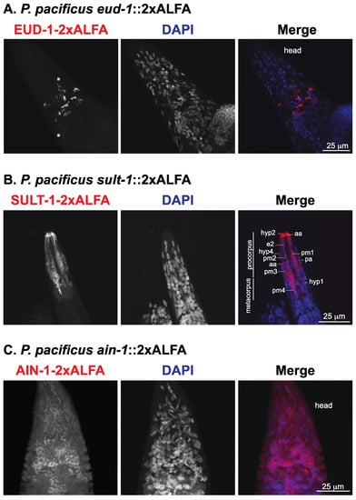 Healthy (not starved) and fully grown worms were collected from 6 cm Petri dishes (n = 10) with M9 medium or from liquid cultures and filtered through a 5 µm Nylon net filter (Milipore Merck, Darmstadt, Germany), as previously described []. All P. pacificus developmental stages were retained by the 5 µm filter, while bacteria passed through. Worms were fixed with 4% para-formaldehyde, 1xPBS (500 µL) in 1.5 mL Eppendorf tubes overnight on a tube rotator. After fixation, the samples were washed three times with 0.5% Triton X-100, 1x PBS (washing solution). To chemically reduce the disulfide bonds between collagen fibers in the cuticle and to enhance the diffusion of the chemical reagents into the specimen, animals were incubated overnight in 500 µL of buffer containing 5% β-mercaptoethanol, 1% Triton X-100 and 0.1 M Tris-HCl pH 7.4, with gentle shaking (300 rpm). Following two washes with 1% Triton X-100, 0.1 M Tris-HCl pH 7.4 buffer and one wash with collagenase buffer (1 mM CaCl2, 1% Triton X-100, 0.1 M Tris pH 7.4), worms were digested in 200 µL of collagenase buffer with 200 units of collagenase type IV (Gibco, Thermo Fisher Scientific, Waltham, MA, USA) at 37 °C for 2–3 hrs or until the thinning of the cuticle caused the worms to break at the vulva region. Afterwards, the samples were washed three times with the washing solution. Digested animals were then incubated for 1 h at RT in 100 µL of blocking solution (1% BSA, 0.5% Triton X-100, 1x PBS). After two washes in washing solution, animals were stained with the primary antibody (FluoTag-X2 anti-ALFA-AbberiorStar580, NanoTag Biotechnologies, Göttigen, Germany, 1:100) in 50 µL of blocking solution, overnight at 4 °C in a tube rotator. Worms were washed thrice with the washing solution, resuspended in VectaShield mounting medium (Vector Laboratories, USA) containing 1 μg/mL 4′,6-diamidino-2-phenylindole (DAPI; Molecular Probes, Thermo Fisher Scientific) and gently mounted on freshly prepared 5% Noble agar pads. Images were acquired on a Leica TCS SP8 microscope and assembled on Fiji (Image J, NIH, Bethesda, MD, USA).